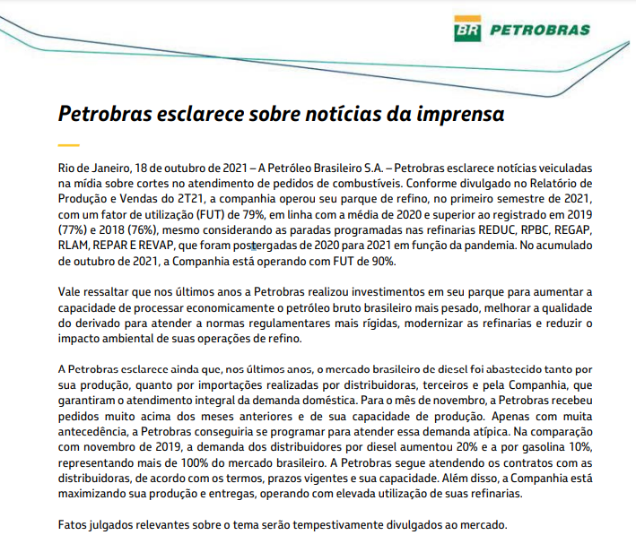 A companhia acrescenta que, no acumulado de outubro, o nível de utilização das refinarias está em 90%. Segundo a empresa, para evitar o desabastecimento do mercado interno, também recorre a importações de diesel.